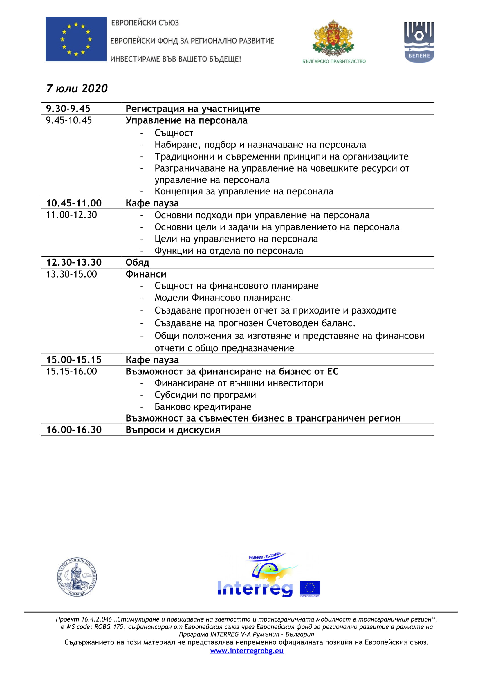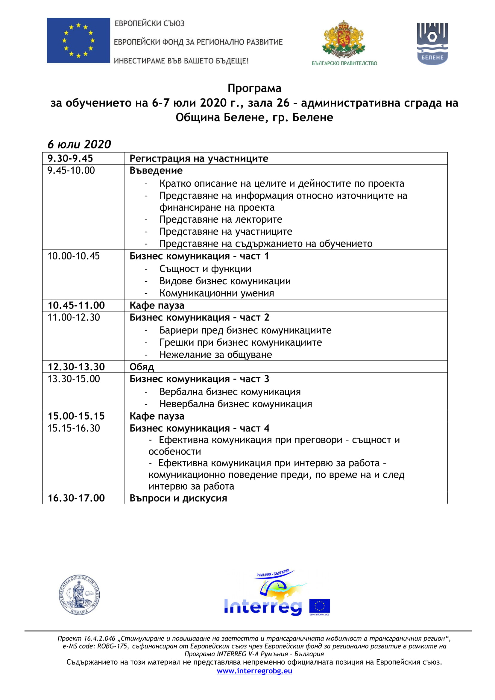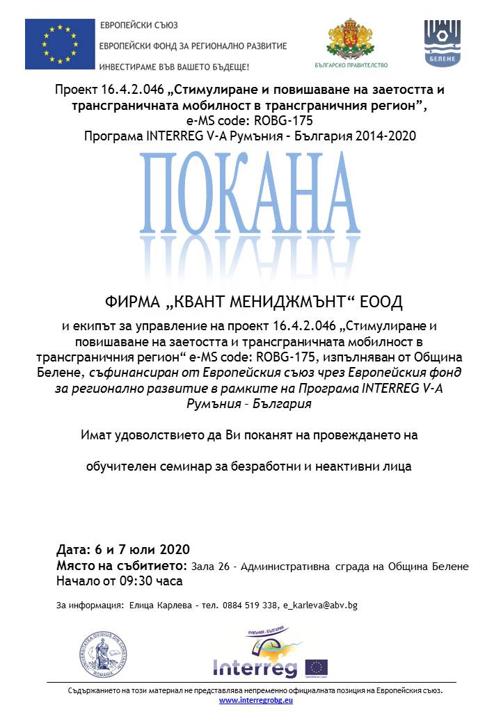 Покана за участие в двудневен обучителен семинар за безработни и неактивни лица в гр. Белене На 6 и 7 юли 2020 г. ще се проведе обучителен семинар за безработни и неактивни лица по проект 16.4.2.046 „Стимулиране и повишаване на заетостта и трансграничната мобилност в трансграничния регион“ e-MS code: ROBG-175